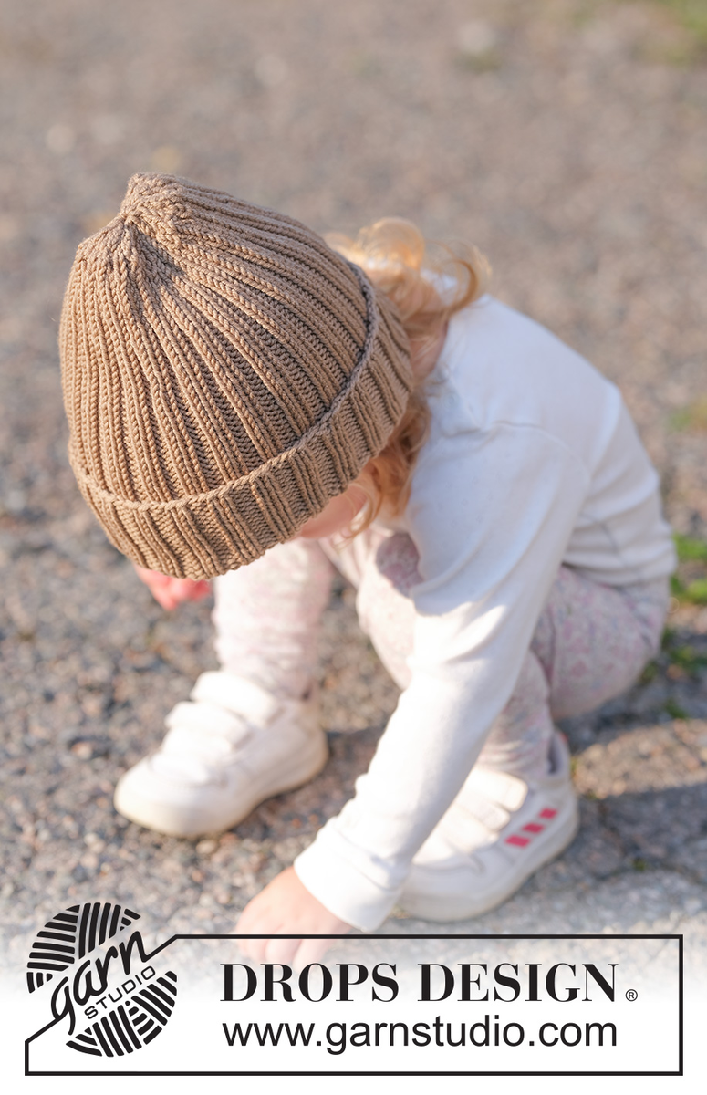 Gestrickte Mütze für Babys und Kinder in DROPS Merino Extra Fine. Die Arbeit wird von unten nach oben im Rippenmuster gestrickt. Größe 2 - 14 Jahre.