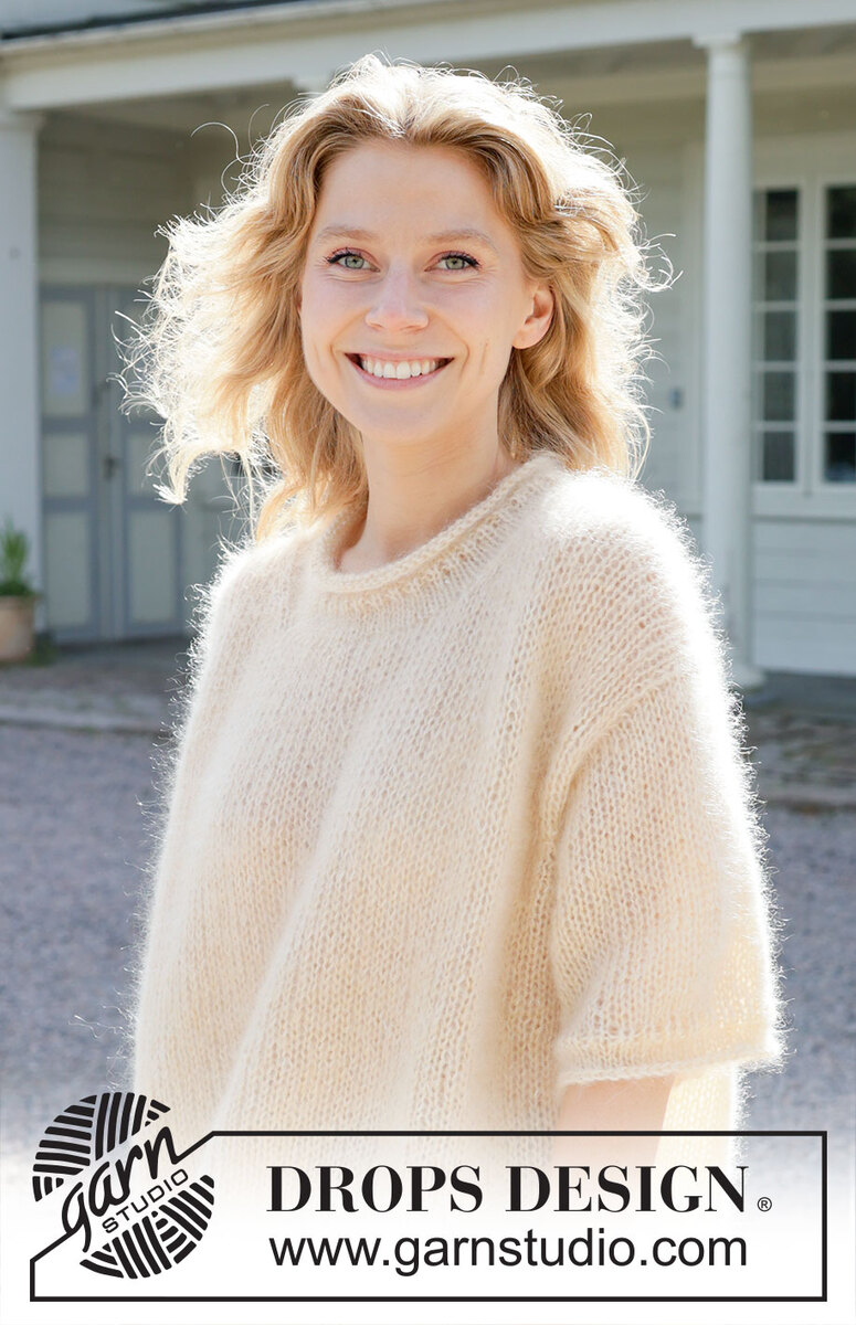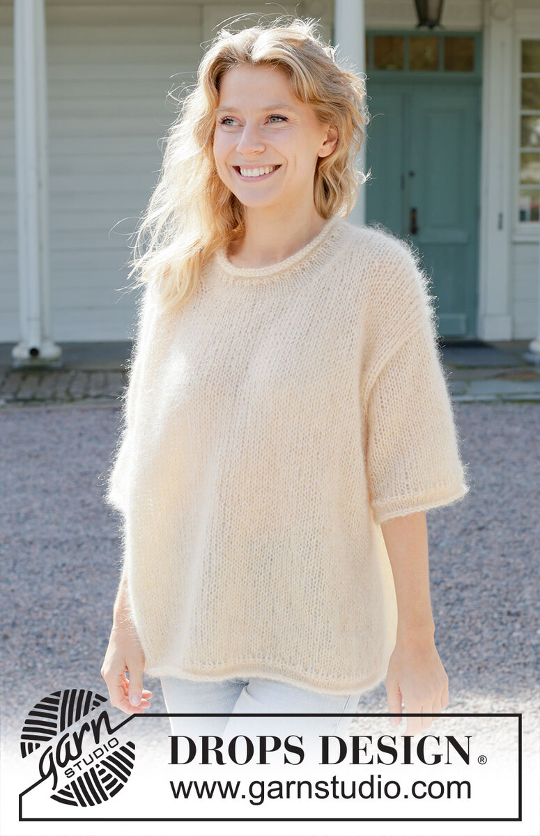 Gestrickter Oversize – Pullover in 4 Fäden DROPS Kid-Silk. Die Arbeit wird von oben nach unten mit europäischer Schulter / Schulterschrägung, kurzen Ärmeln und Rollrändern gestrickt. Größe XS - XXL.