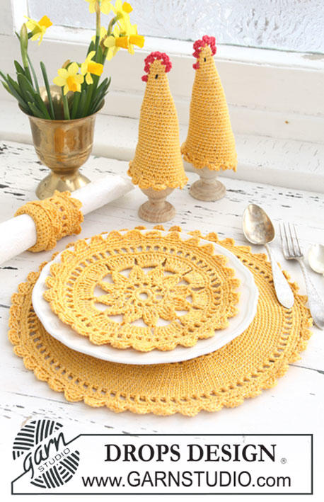Das Set besteht aus: Crochet DROPS Tüchern, Eierwärmer und Serviettenring in "Safran" und "Glitter".