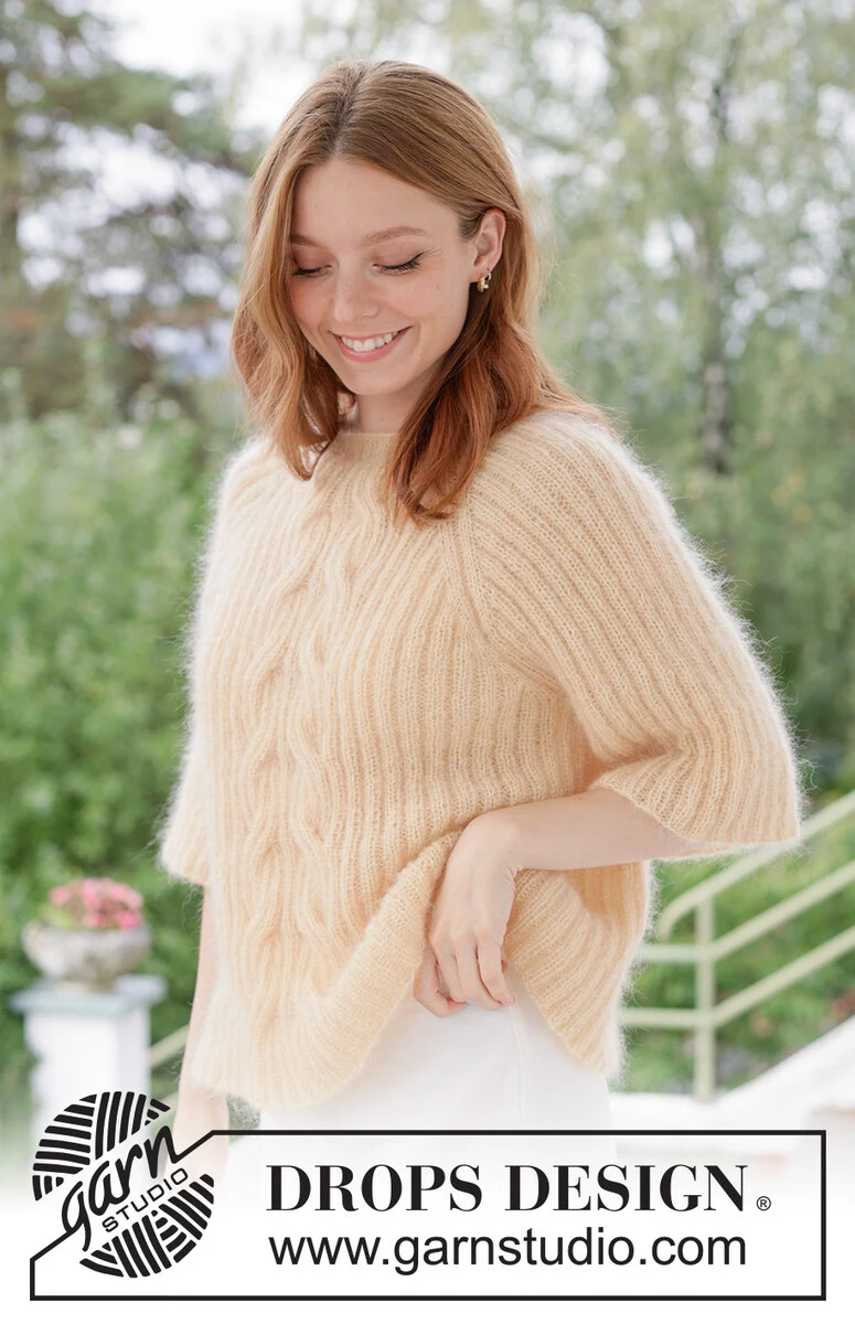 Gestrickter Pullover in 2 Fäden DROPS Kid-Silk. Die Arbeit wird von oben nach unten mit Raglan, Zopfmuster und Rippenmuster gestrickt. Größe XS - XXXL.