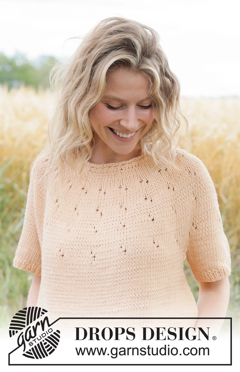 Gestrickter Pullover mit kurzen Ärmeln in DROPS Paris. Die Arbeit wird von oben nach unten mit Rollrand, Rundpasse und Lochmuster an der Passe gestrickt. Größe XS - XXXL.