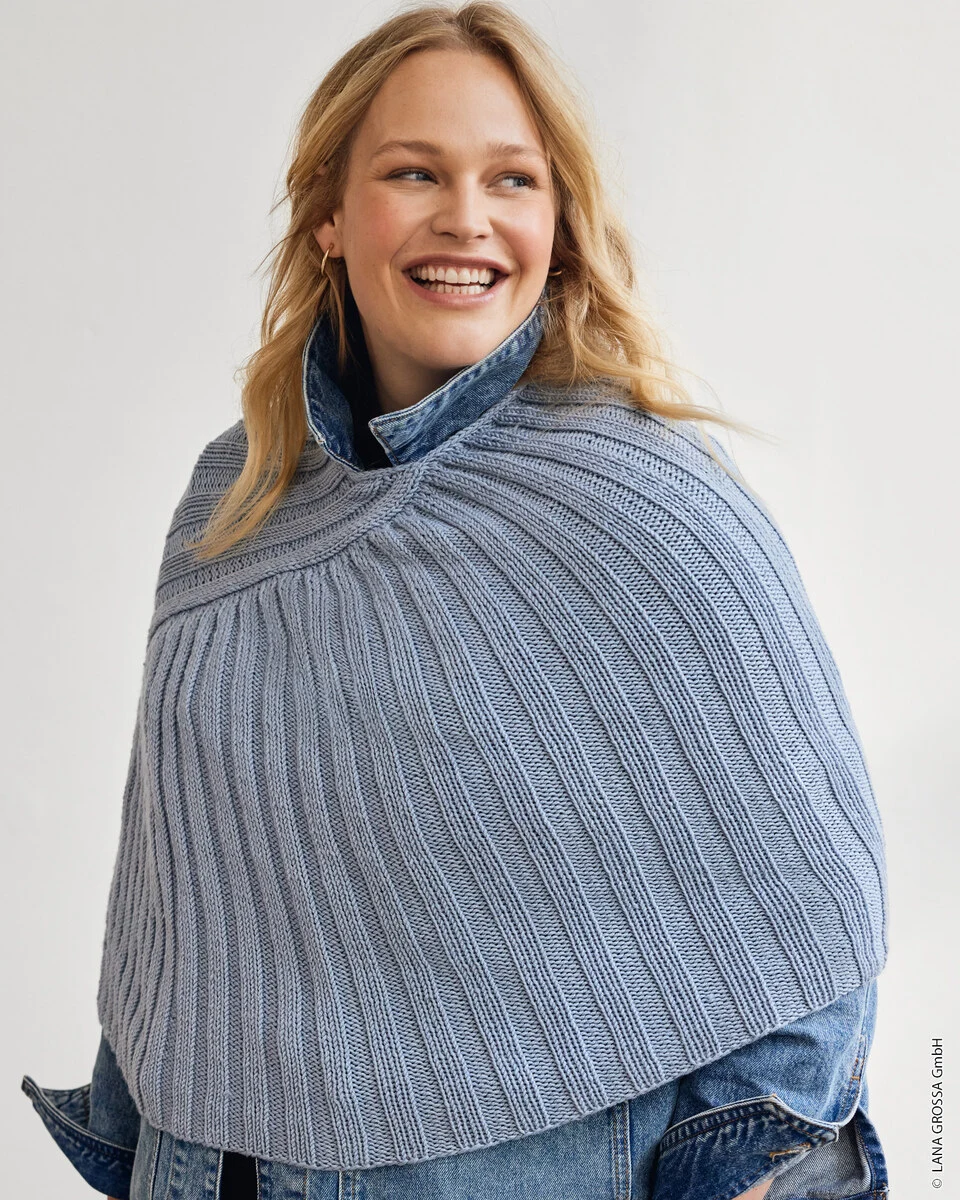 Gestrickter Poncho aus Lana Grossa Cool Wool Big. Der Poncho wird im Rippenmuster mit schräger Form gestrickt und mit einer schönen I-Cord-Kante abgeschlossen. Größe ca. 102 (112) cm Umfang und 50 (58) cm Länge.
