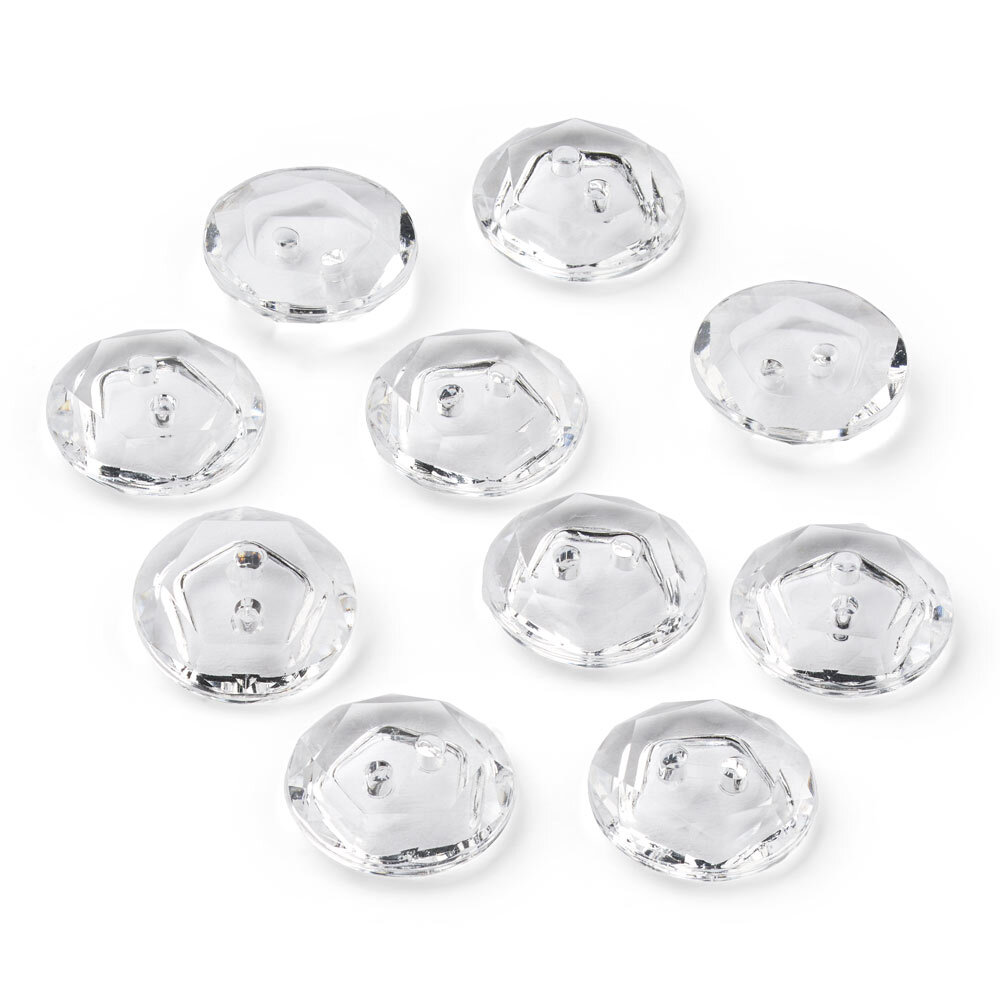 Ein Set mit 10 klaren Kristallknöpfen aus Kunststoff, jeweils mit einem Durchmesser von 12 mm. Die Knöpfe haben eine facettierte Oberfläche, die das Licht schön einfängt und deinen Projekten eine elegante Note verleiht.