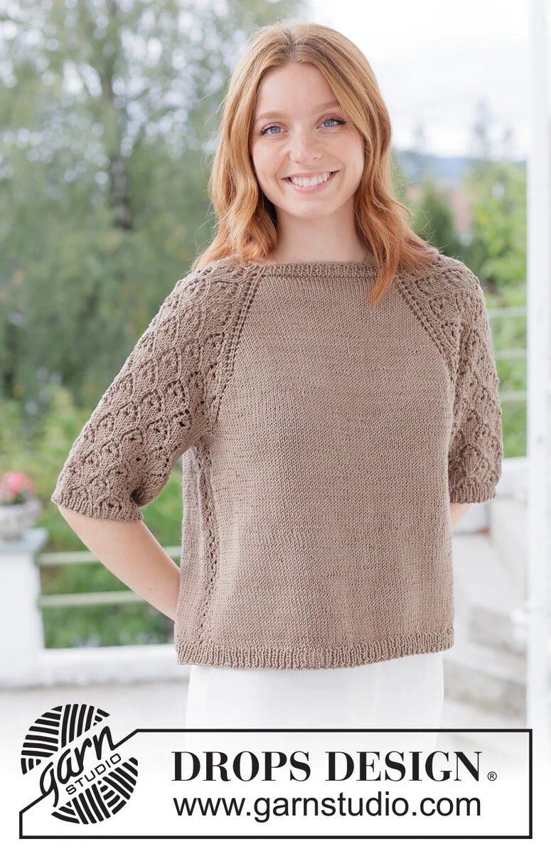 Gestrickter Pullover DROPS Muskat. Die Arbeit wird von oben nach unten mit Raglan, Lochmuster und kurzen Ärmeln gestrickt. Größe XS - XXXL.