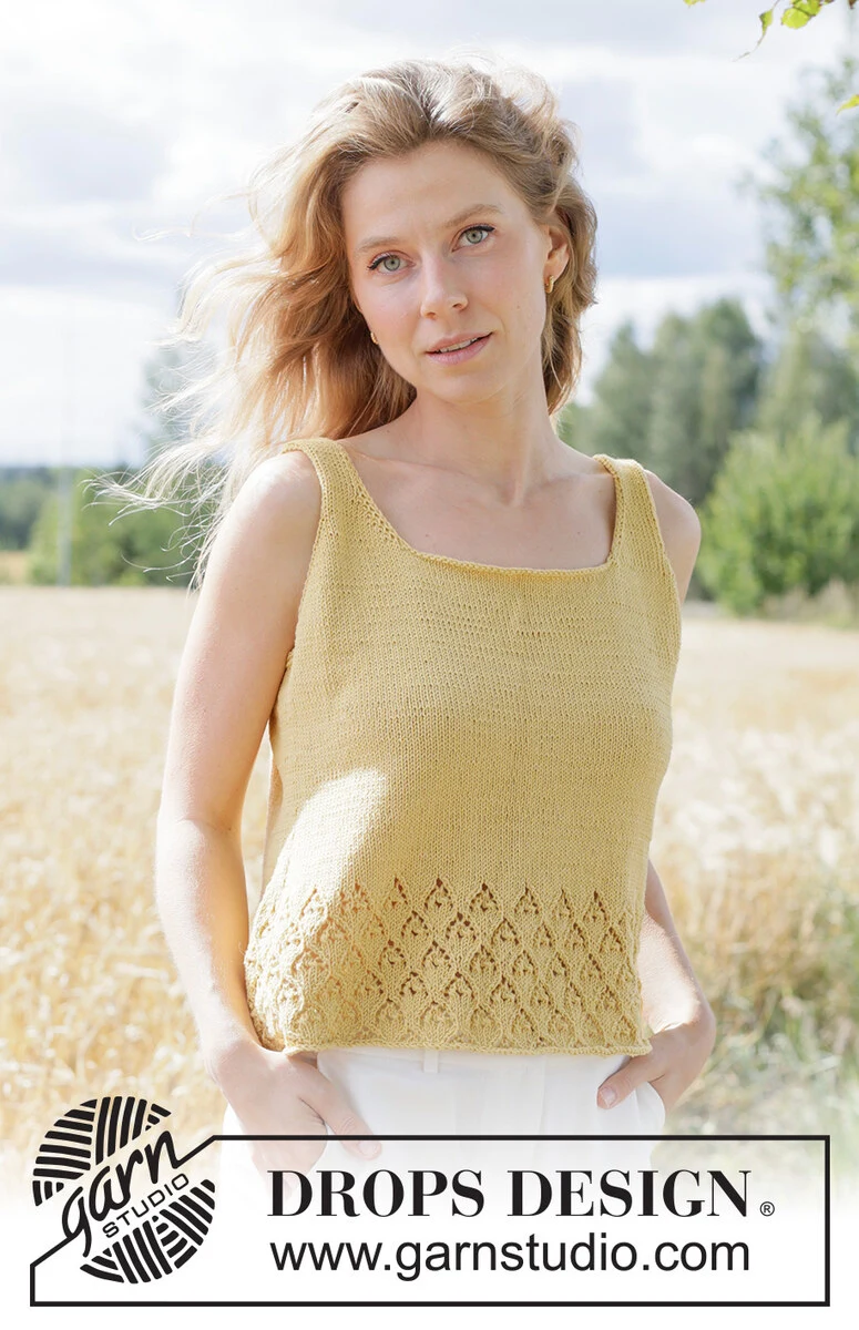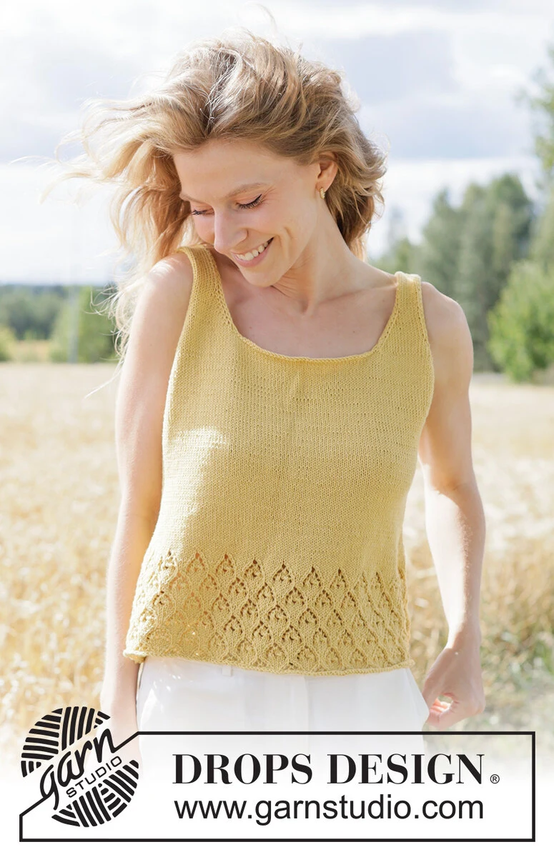 Gestricktes Top / Hemd in DROPS Safran. Die Arbeit wird von oben nach unten mit Lochmuster und I-Cord gestrickt. Größe XS - XXXL.