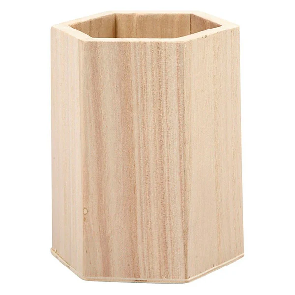 Der Stifthalter hat ein schlichtes, aber elegantes sechseckiges Design mit einer natürlichen Holzoberfläche, so dass er sich gut in jede Art von Büroeinrichtung einfügt und sogar mit Ösen oder Perlen verziert werden kann. Der strapazierfähige Behälter aus Kaiserholz misst 10 x 8 cm und hat die perfekte Größe für die Aufbewahrung von Gegenständen auf Ihrem Schreibtisch oder an einem anderen vorgesehenen Platz, ohne dabei zu aufdringlich zu sein oder zu viel Platz einzunehmen.